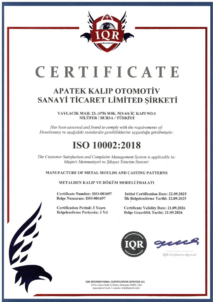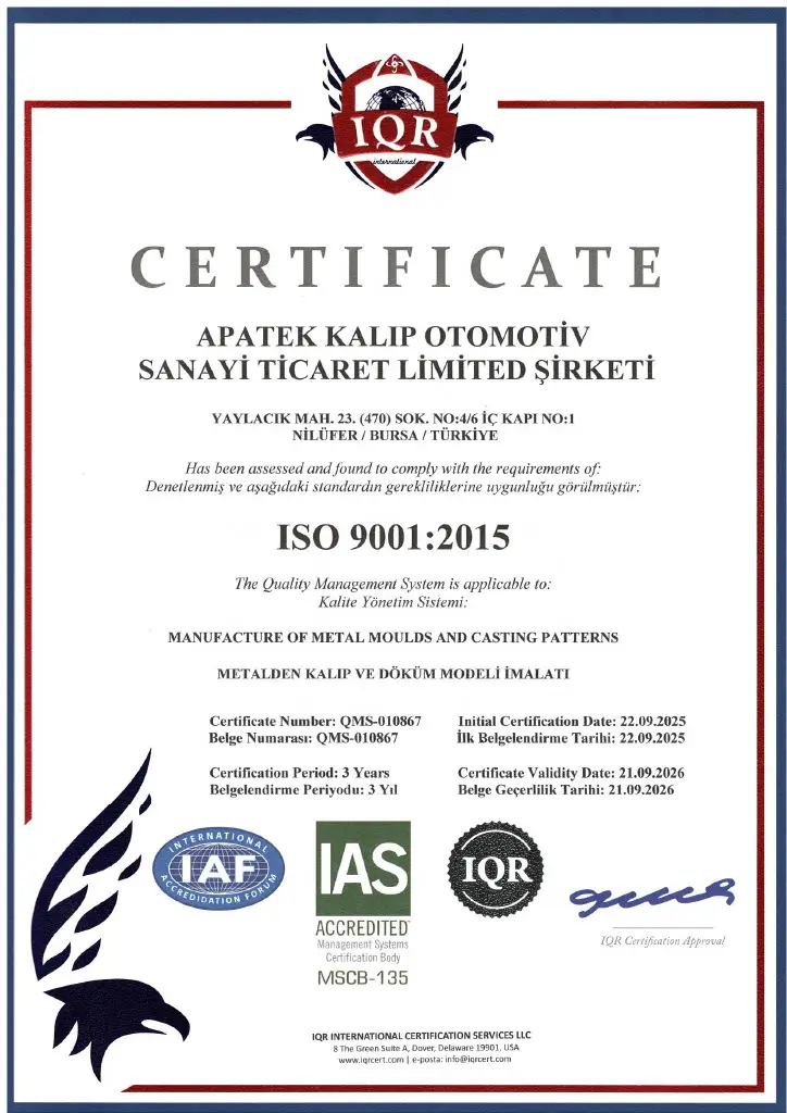 Apatek Kalıp Otomotiv Sanayi Ticaret Ltd. Şti., üretim süreçlerinde uluslararası kalite ve müşteri memnuniyeti standartlarını karşılayan bir yönetim sistemiyle faaliyet göstermektedir.